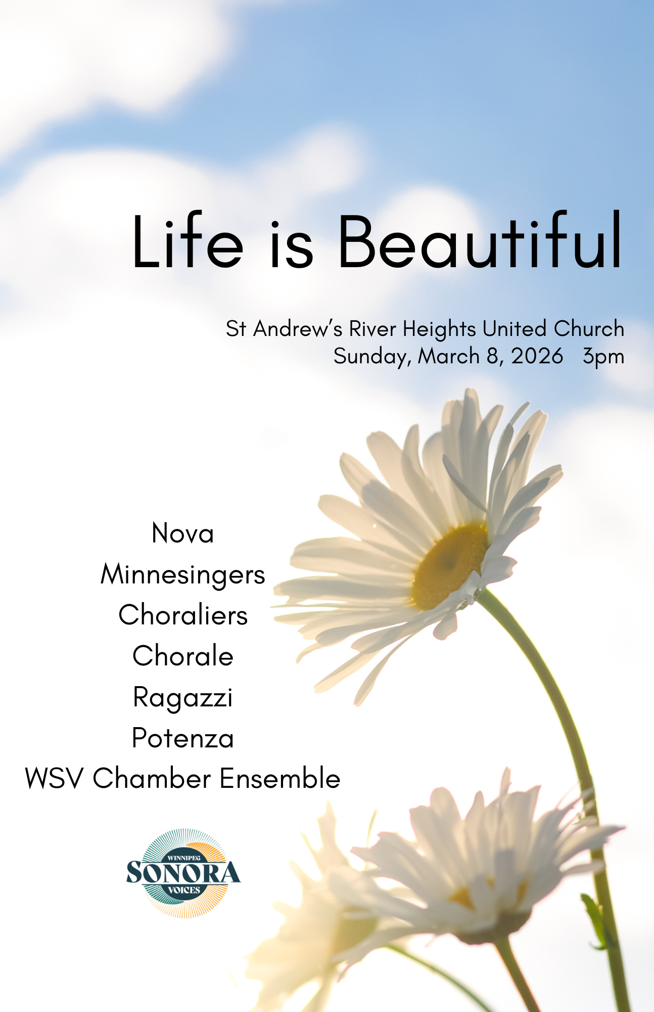 Life is Beautiful St. Andrew’s River Heights United Church 255 Oak St. Winnipeg, MB March 8, 2026 3:00 pm Purchase Tickets Performance Sponsor